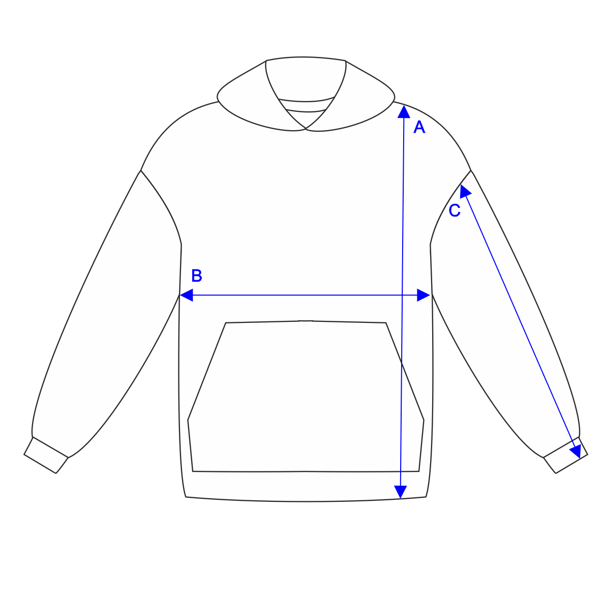 XS – длина изделия (А) - 65 см, обхват груди (В) - 118 см, длина рукава (С) - 72 см S – длина изделия (А) - 67 см, обхват груди (В) - 122 см, длина рукава (С) - 73 см M – длина изделия (А) - 69 см, обхват груди (В) - 126 см, длина рукава (С) - 75 см L – длина изделия (А) - 72 см, обхват груди (В) - 130 см, длина рукава (С) - 76 см XL – длина изделия (А) - 74 см, обхват груди (В) - 134 см, длина рукава (С) - 78 см 2XL – длина изделия (А) - 74 см, обхват груди (В) - 138 см, длина рукава (С) - 80 см 3XL – длина изделия (А) - 76 см, обхват груди (В) - 142 см, длина рукава (С) - 81 см