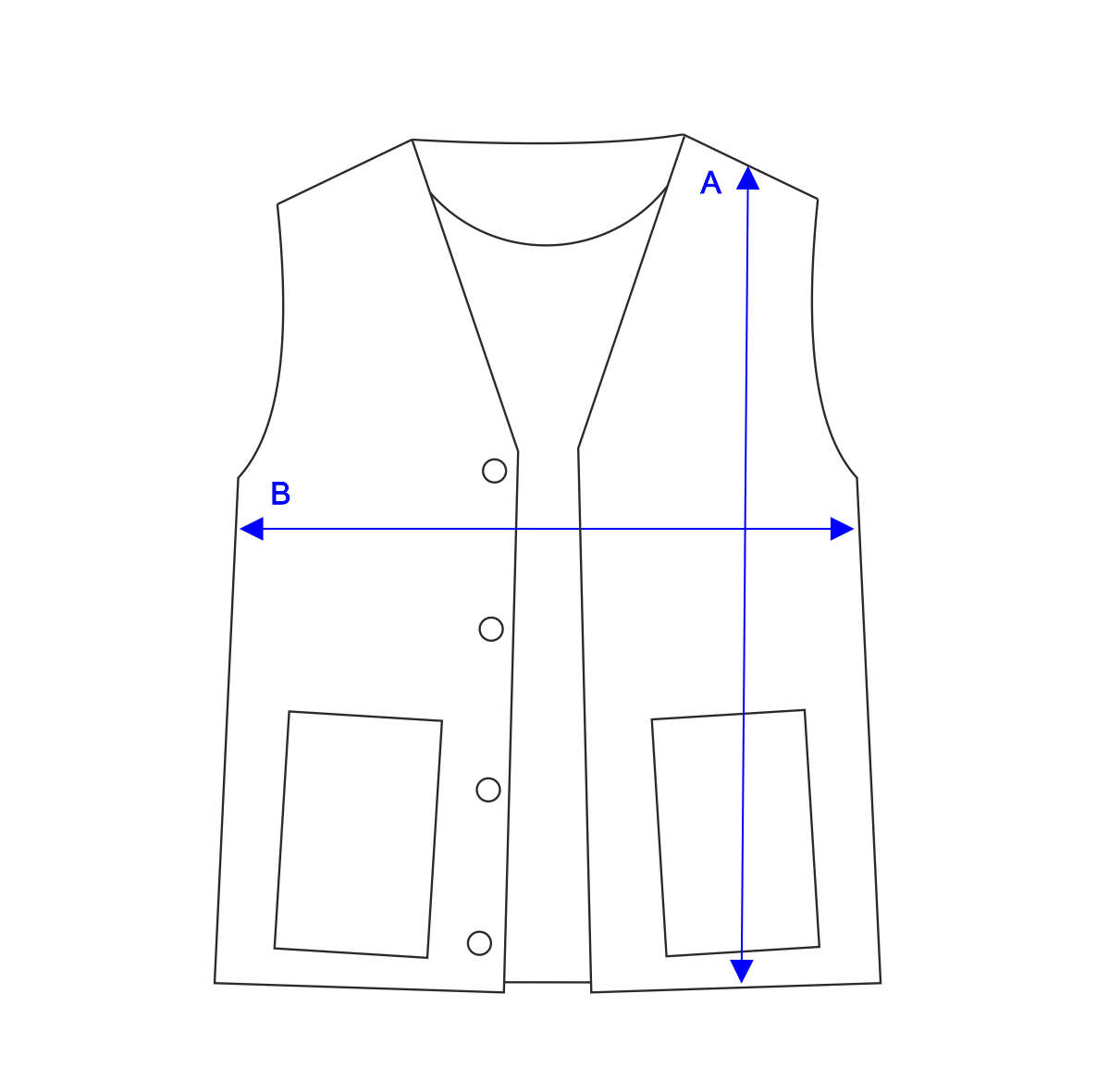 XS – длина изделия (А) - 68 см, обхват груди (В) - 110 см S – длина изделия (А) - 68 см, обхват груди (В) - 116 см M – длина изделия (А) - 68 см, обхват груди (В) - 122 см L – длина изделия (А) - 68 см, обхват груди (В) - 128 см XL – длина изделия (А) - 71 см, обхват груди (В) - 134 см 2XL – длина изделия (А) - 71 см, обхват груди (В) - 140 см