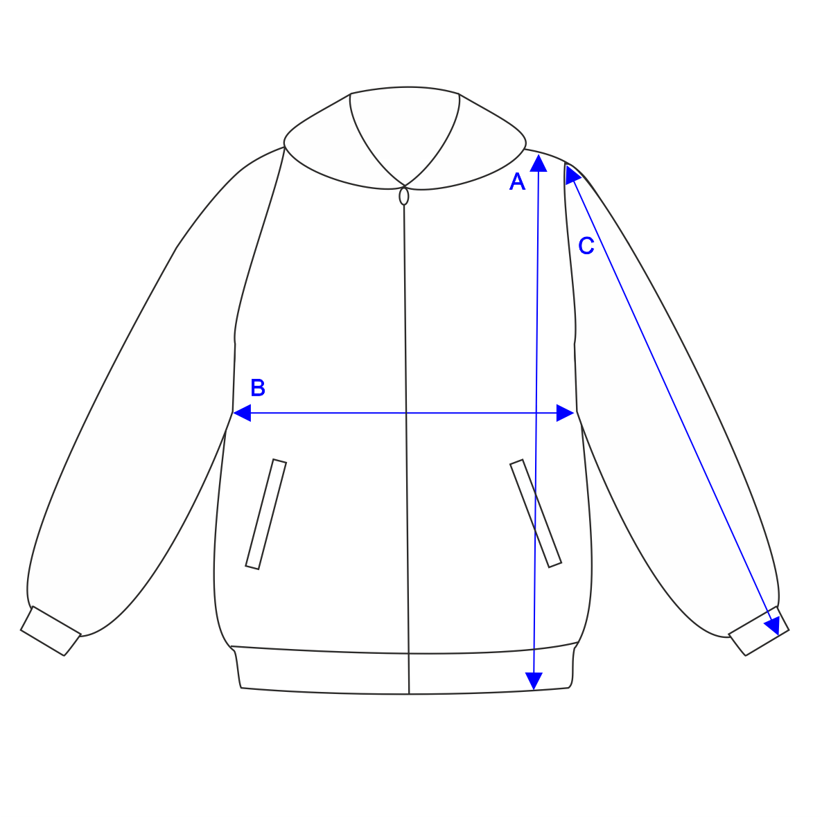 XS – длина изделия (А) - 62 см, обхват груди (В) - 134 см, длина рукава (С) - 74 см S – длина изделия (А) - 63 см, обхват груди (В) - 138 см, длина рукава (С) - 76 см M – длина изделия (А) - 65 см, обхват груди (В) - 142 см, длина рукава (С) - 76 см L – длина изделия (А) - 66 см, обхват груди (В) - 146 см, длина рукава (С) - 78 см XL – длина изделия (А) - 68 см, обхват груди (В) - 150 см, длина рукава (С) - 78 см 2XL – длина изделия (А) - 68 см, обхват груди (В) - 154 см, длина рукава (С) - 78 см 3XL – длина изделия (А) - 70 см, обхват груди (В) - 158 см, длина рукава (С) - 80 см