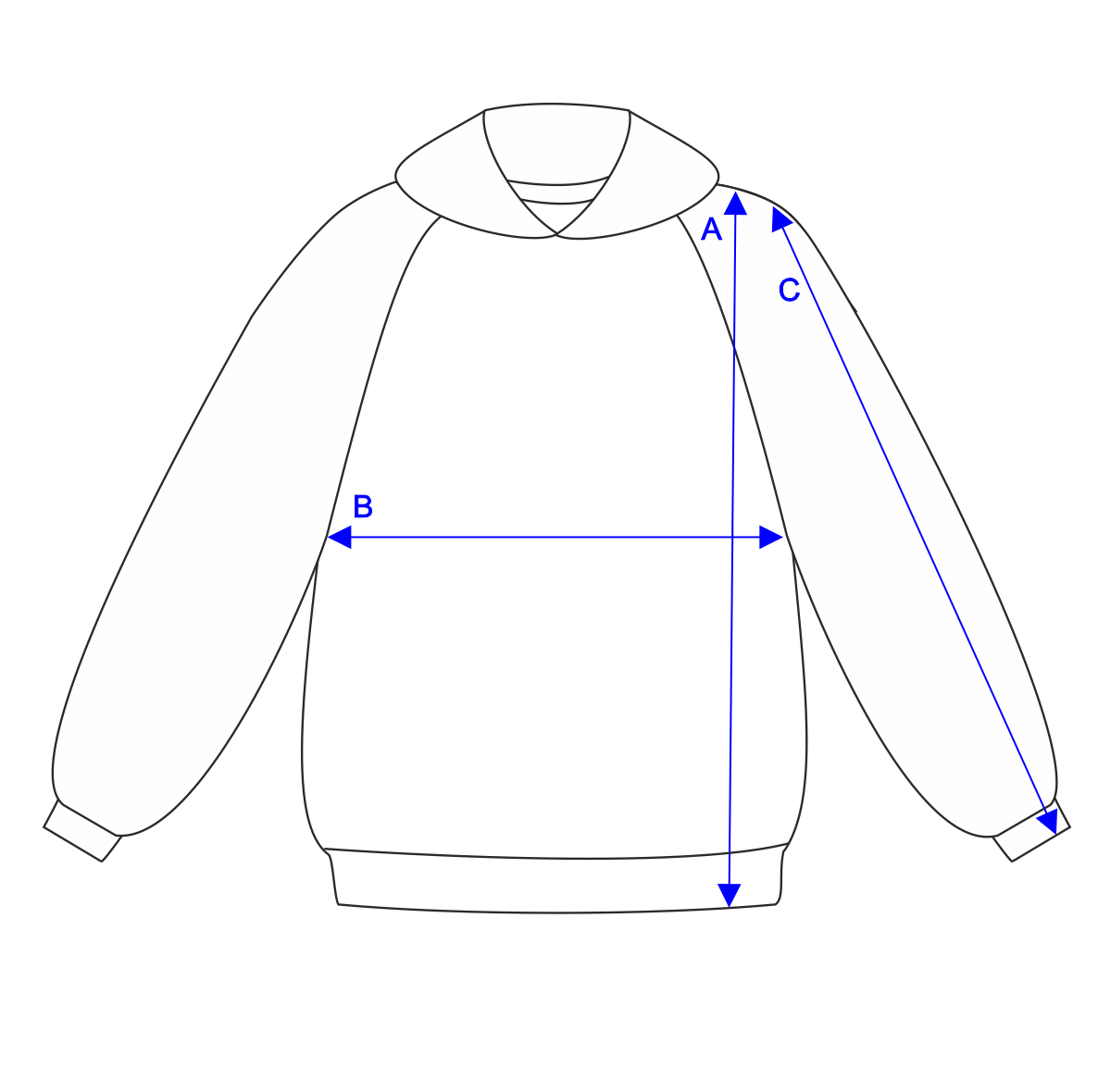 2XL – длина изделия (А) - 66 см, обхват груди (В) - 152 см, длина рукава (С) - 73 см