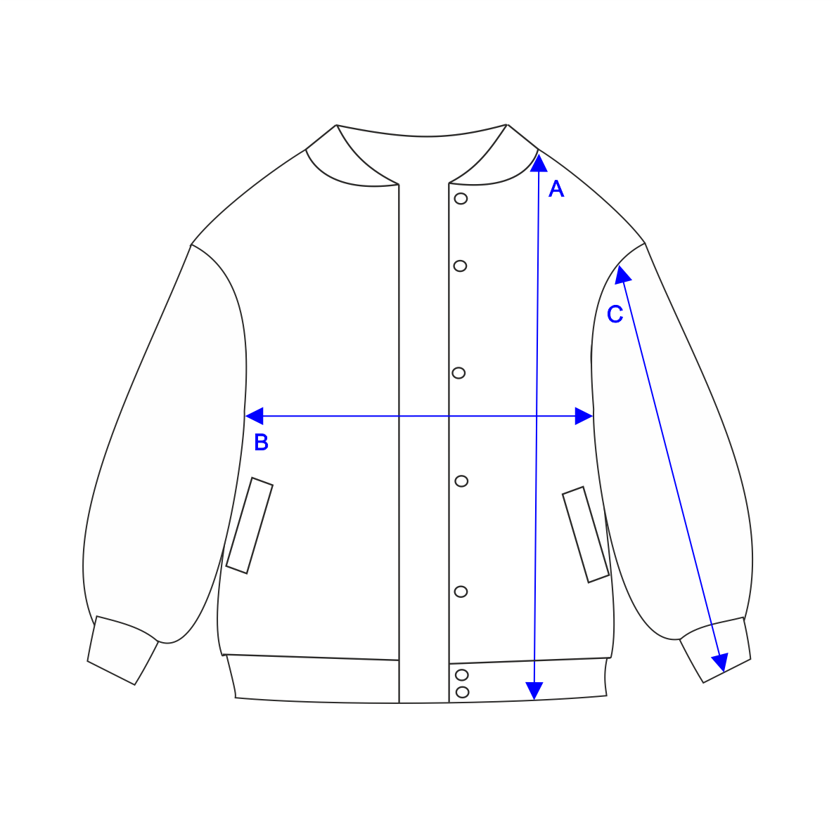 XS – длина изделия (А) - 63 см, обхват груди (В) - 132 см, длина рукава (С) - 70 см S – длина изделия (А) - 65 см, обхват груди (В) - 136 см, длина рукава (С) - 73 см M – длина изделия (А) - 67 см, обхват груди (В) - 140 см, длина рукава (С) - 75 см L – длина изделия (А) - 68 см, обхват груди (В) - 144 см, длина рукава (С) - 75 см XL – длина изделия (А) - 70 см, обхват груди (В) - 148 см, длина рукава (С) - 76 см 2XL – длина изделия (А) - 70 см, обхват груди (В) - 152 см, длина рукава (С) - 76 см 3XL – длина изделия (А) - 72 см, обхват груди (В) - 156 см, длина рукава (С) - 77 см