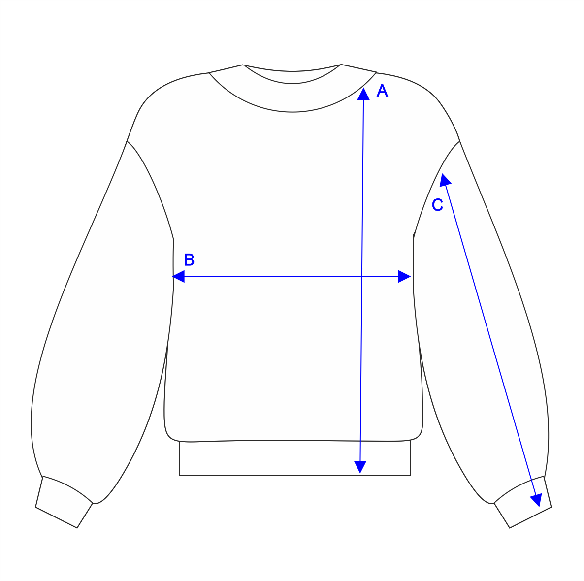 S – длина изделия (А) - 64 см, обхват груди (В) - 142 см, длина рукава (С) - 80 см