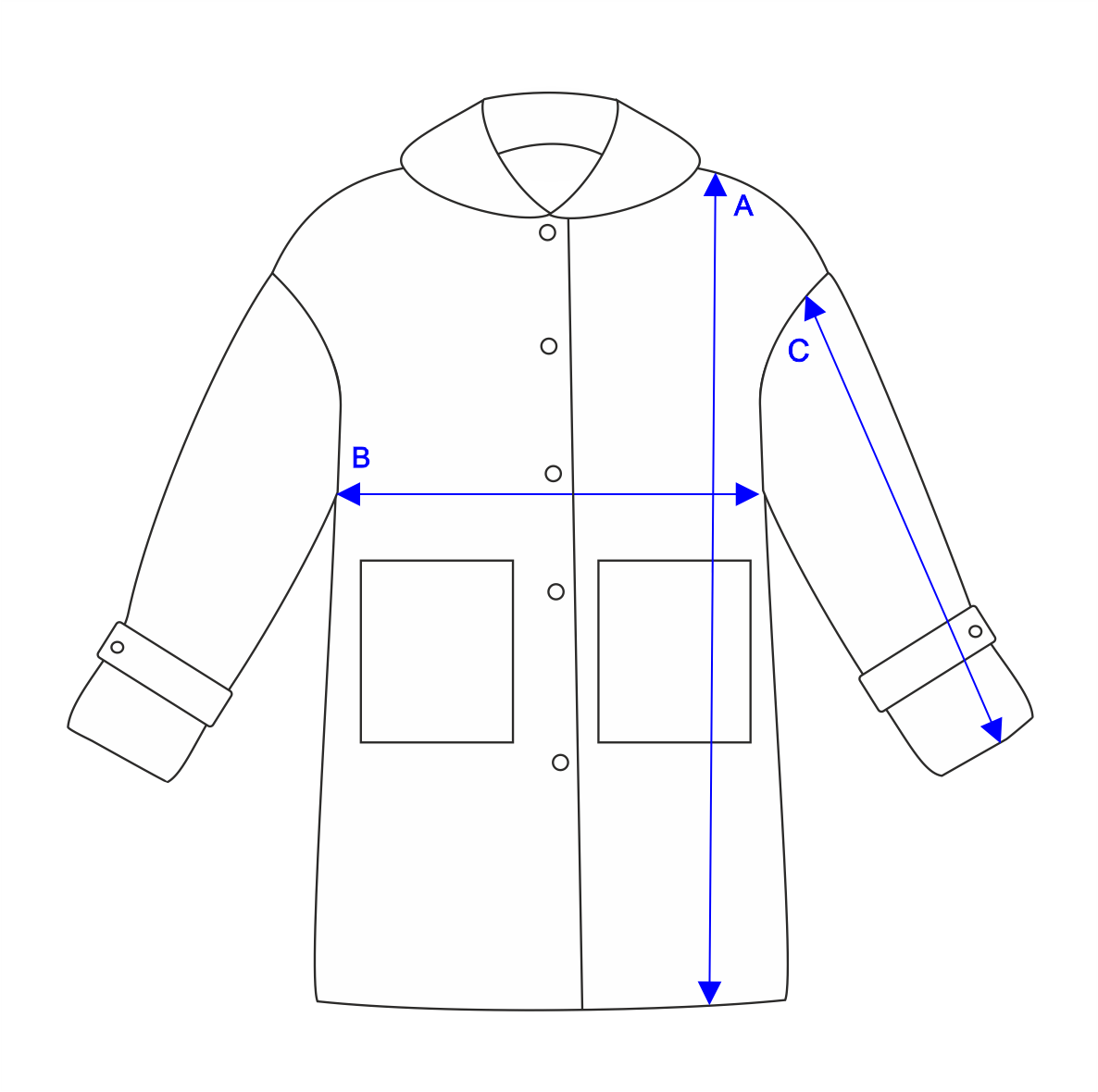 S – длина изделия (А) - 96 см, обхват груди (В) - 120 см, длина рукава (С) - 64 см M – длина изделия (А) - 98 см, обхват груди (В) - 124 см, длина рукава (С) - 66 см L – длина изделия (А) - 98 см, обхват груди (В) - 128 см, длина рукава (С) - 68 см XL – длина изделия (А) - 100 см, обхват груди (В) - 132 см, длина рукава (С) - 68 см 2XL – длина изделия (А) - 100 см, обхват груди (В) - 136 см, длина рукава (С) - 70 см 3XL – длина изделия (А) - 102 см, обхват груди (В) - 140 см, длина рукава (С) - 72 см